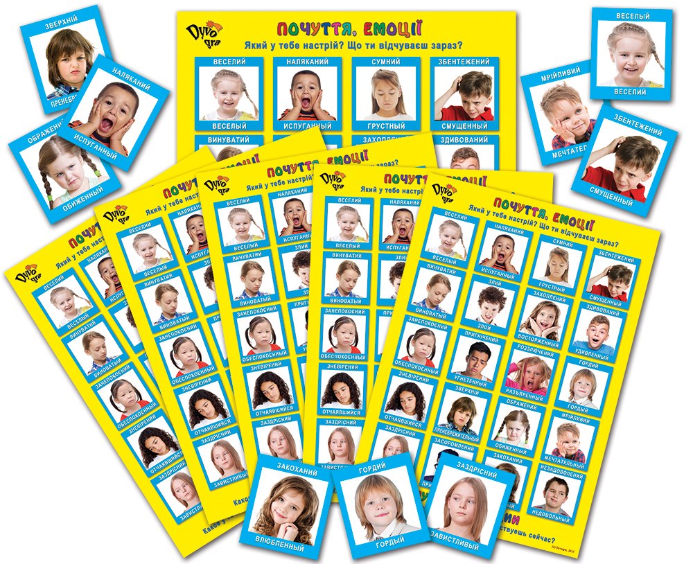 великий яскравий постер А3 з фотографіями дітей та підписами до 20 емоційних станів;